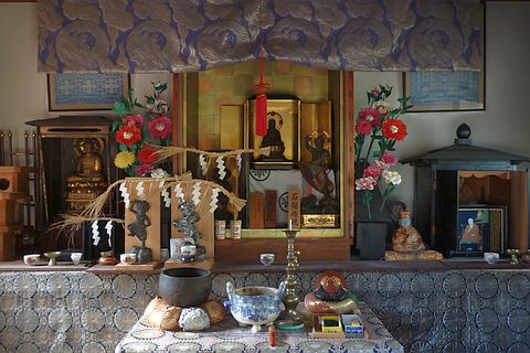 右座、阿彌陀如來、左座、地藏菩薩。弘法大師。彌勒佛。位牌堂にあり。