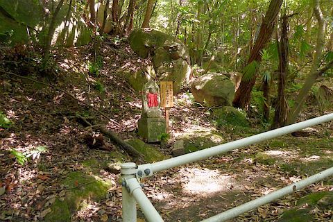 一、堂一宇 本尊、役行者。 作しれず。 不動明王 大石に彫付大像也。