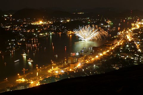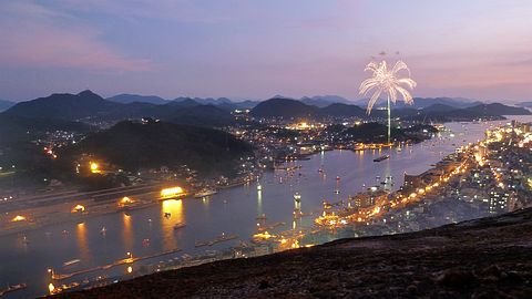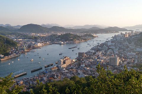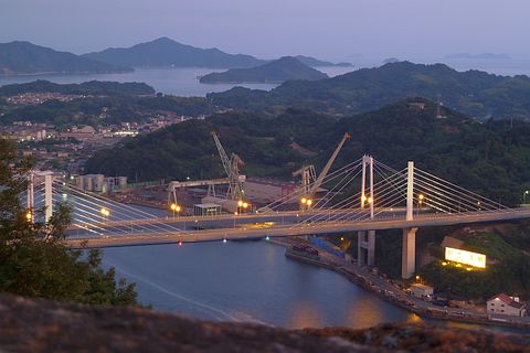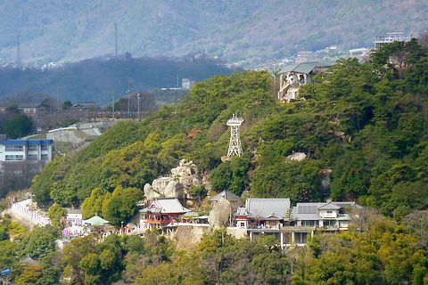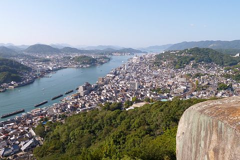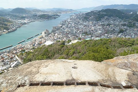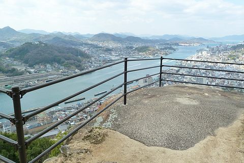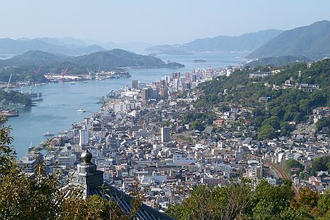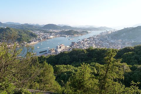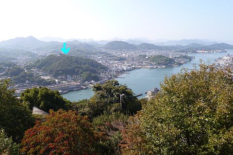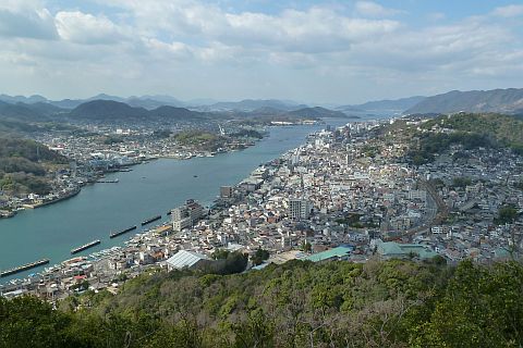 中央に尾道市役所、尾道水道を挟んで向かって左に小歌島、右に千光寺山(大寶山)