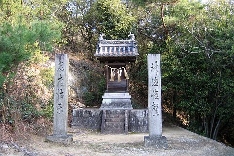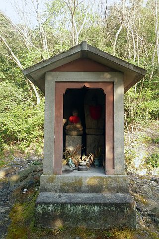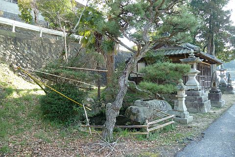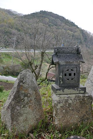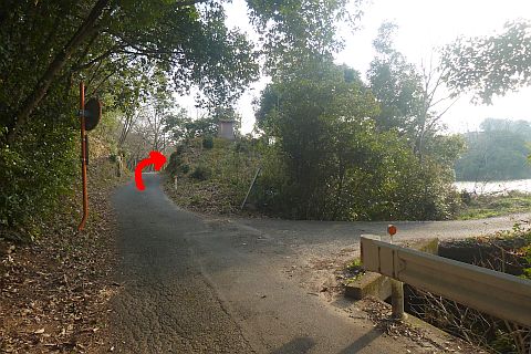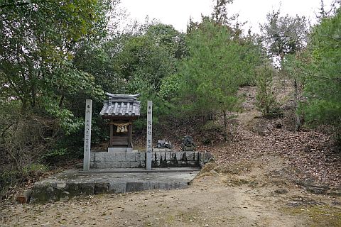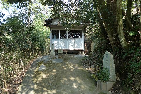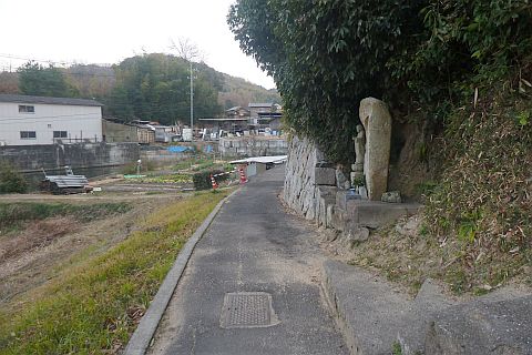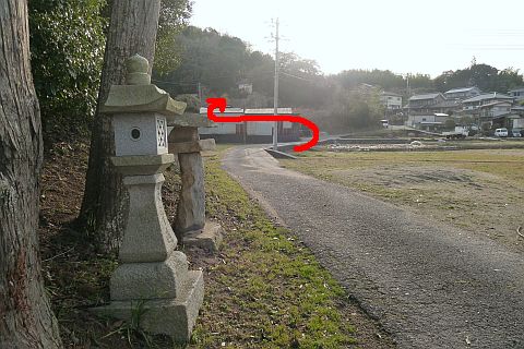 羽方神社前から車道を西へ115m進み、五叉路を左折して山沿いの細道を南南東へ45m進む