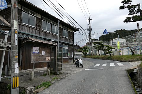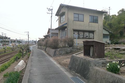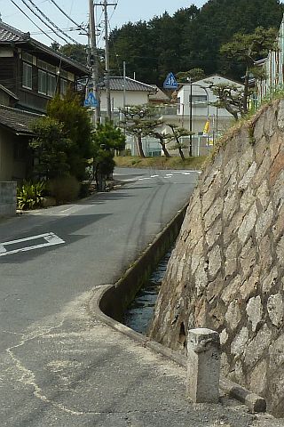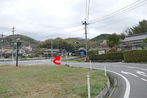用之江交差点まで進み、国道2号線を横断して西南西へ340m進み、Y字路を左折