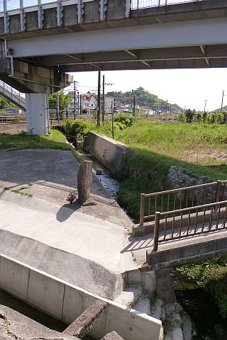車道に出て右折し、西へ20m進んで左折。川沿いの細道を南へ34m進む。