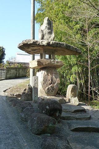 妙見社前から東南東へ30m程下り、Y字路を右折して細道を南へ108m進むと石鳥居の横に出る。