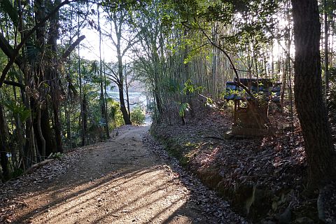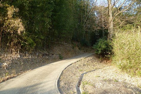 舗装路を北北東へ50m程進んだ所で左折し、竹藪の中の細道を西へ25m上る