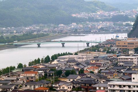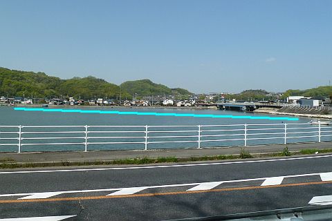 向かって左に岡山県笠岡陸上競技場、中央に金崎大橋と生江浜、右に金崎、手前に西の浜