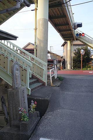 交通事故犠牲者3人の名が刻まれている。昭和40年代に建立。