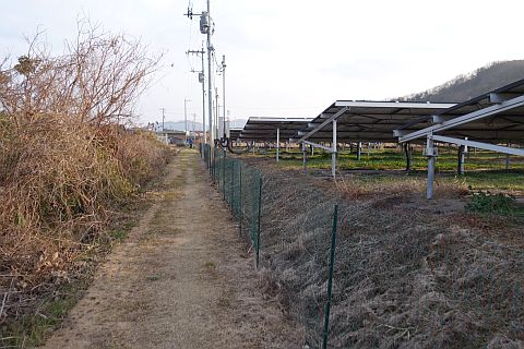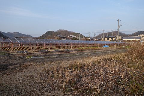 かつて塩田があった場所。現在は太陽光発電施設と田畑。