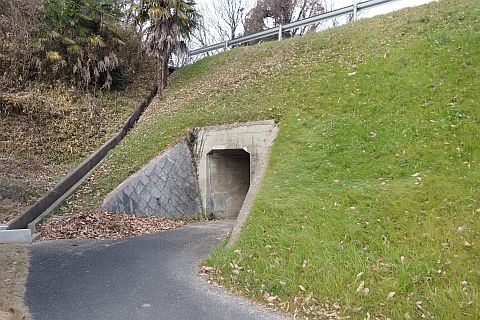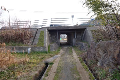 西へ37m進んで丁字路を右折し、2号線の下を通過。