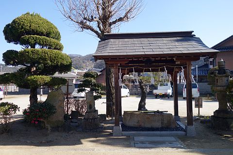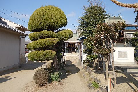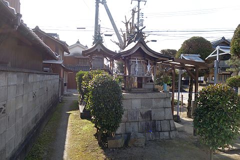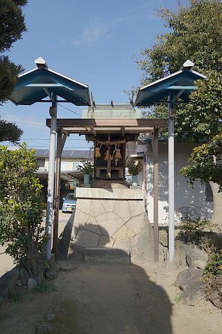 厳島神社の本殿の後ろ(カーブミラーの横)にある