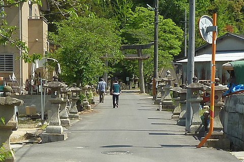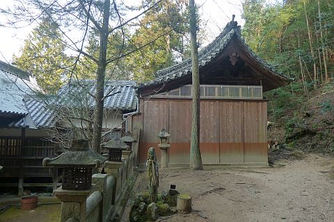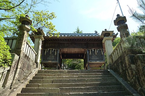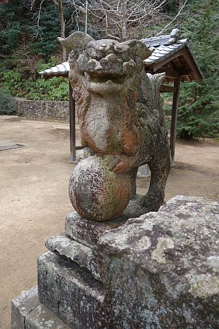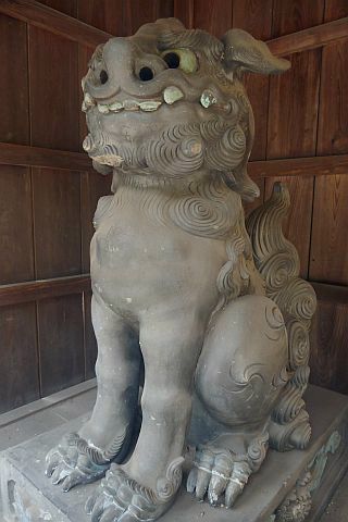 随神門の正面に随神像1対、背面に陶製の狛犬1対が安置されている