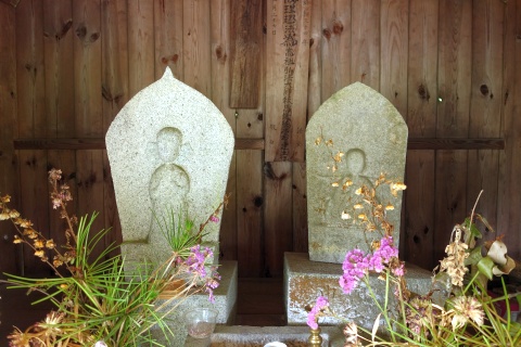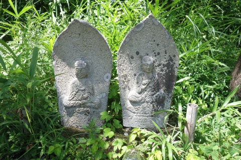 向かって左の像は地蔵菩薩坐像 + 牛、右の像は地蔵菩薩立像 + 牛。