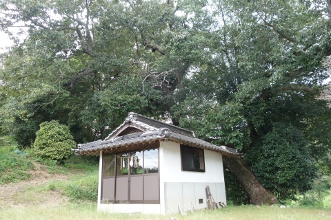 矢印向かって左から荒神社とアベマキ、薬師堂、大師堂