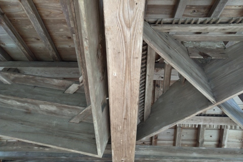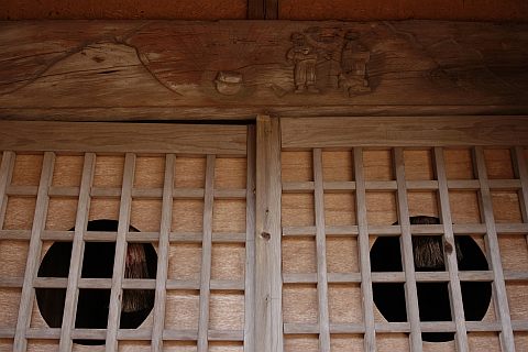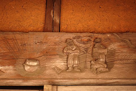 梁に輿(棺運搬用)が置かれている
