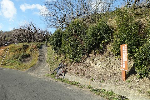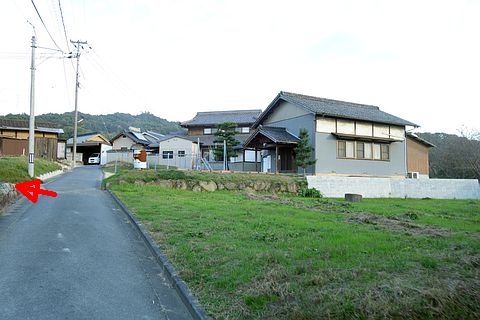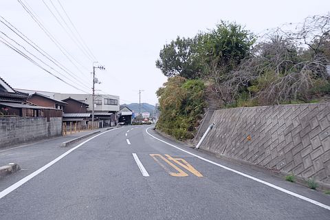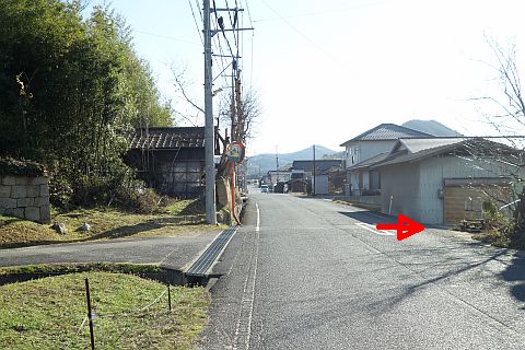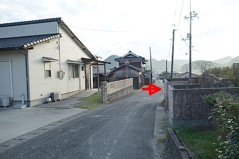 細道を南西へ50m下り、南へ53m進み、南西へ30m上り、十字路を左折