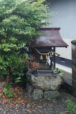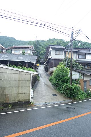 地神様前の丁字路を右折して北西へ40m進み、丁字路を左折して細道を道なりに90m進む。