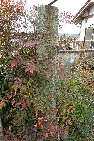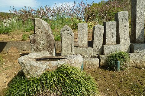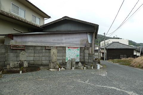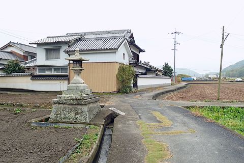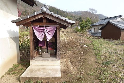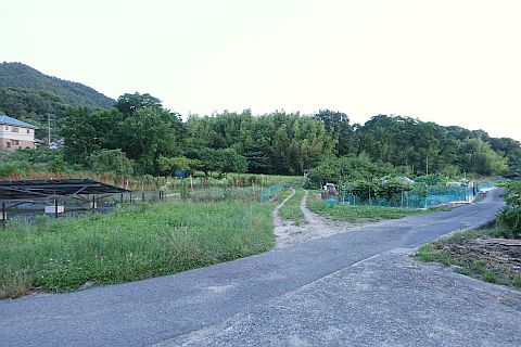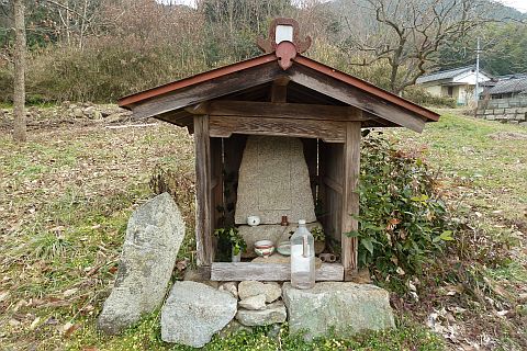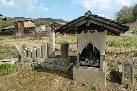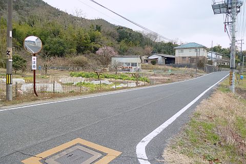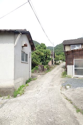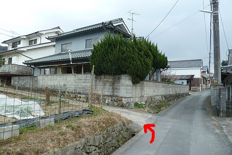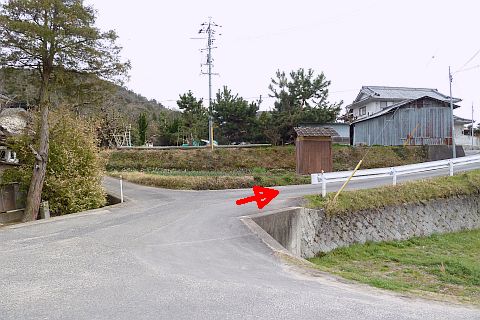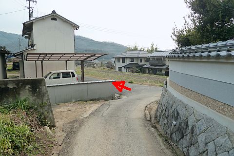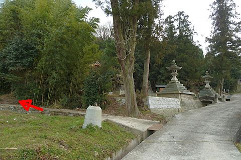 民家の横にある丁字路を右折して墓地への細道を南西へ62m進み、