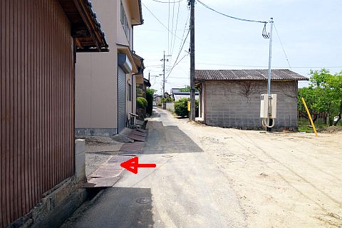 丁字路に戻り、西へ155m、北西へ50m下って旧県道の交差点を横断