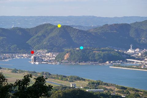 龍王山(黄/標高175m)、古城山(青/標高68.3m)、威徳寺(赤)
