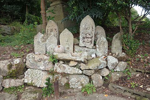大師像の向かって左に万人講供養碑、それ以外は地蔵菩薩像
