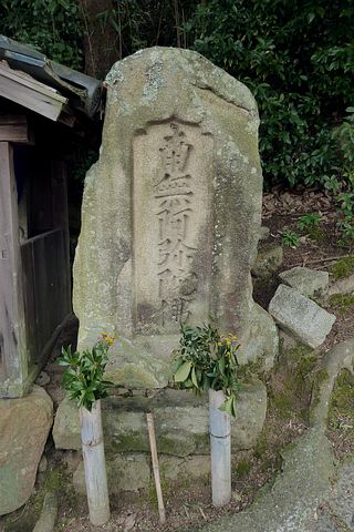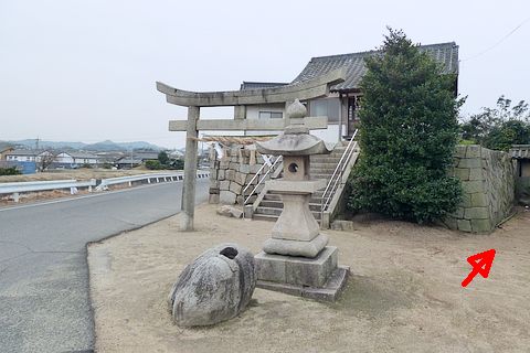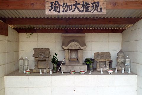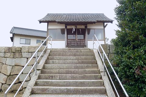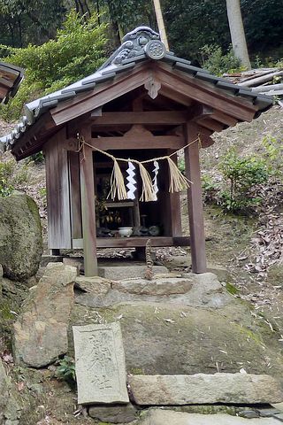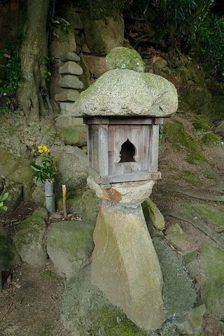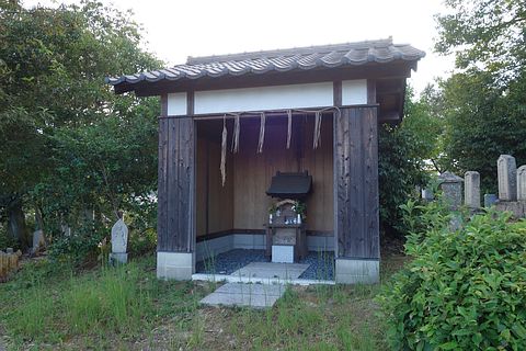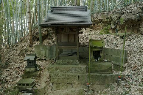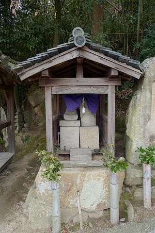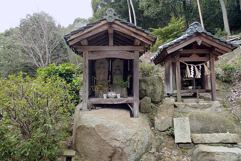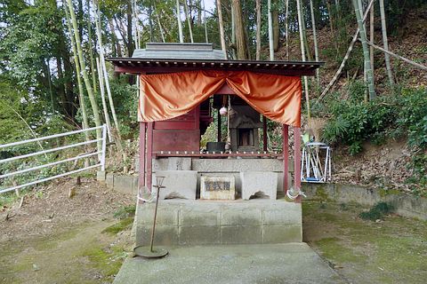 祭神未確認。石鳥居と手水鉢、瓦質の祠がある。