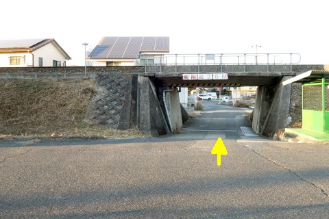 井原線の下をくぐり、北へ35m進んで花野の交差点を左折