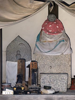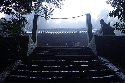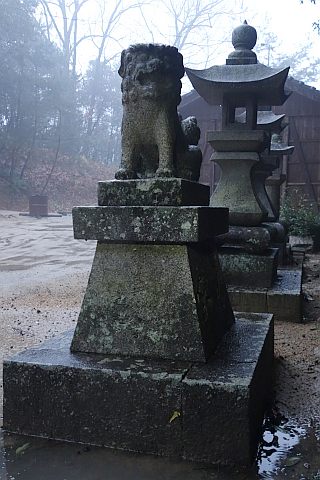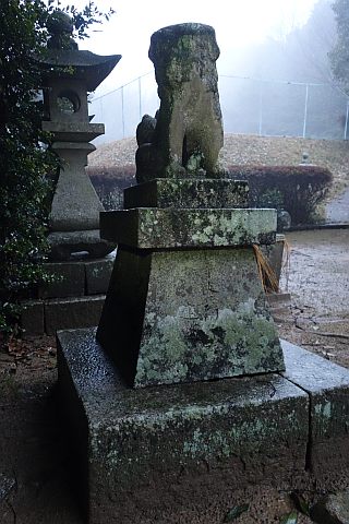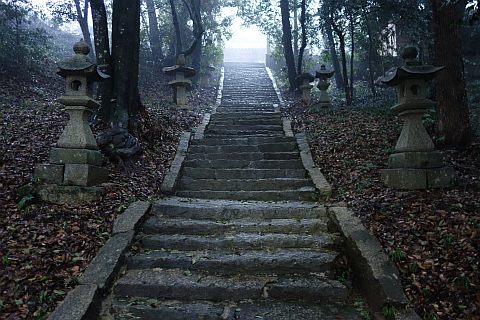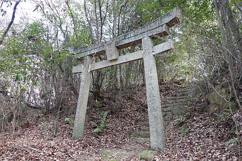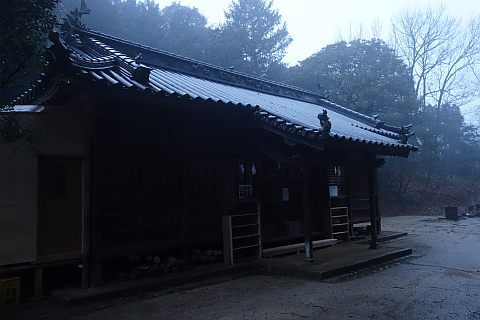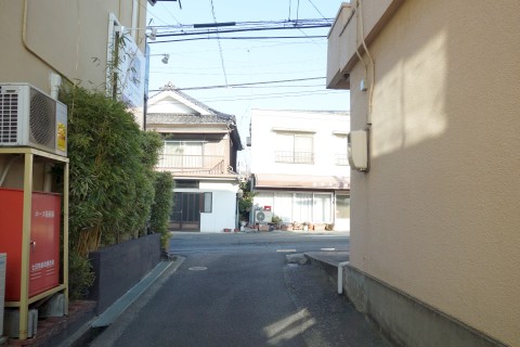 丁字路を左折して、細道を東へ55m下り、参道を東へ50m上る。