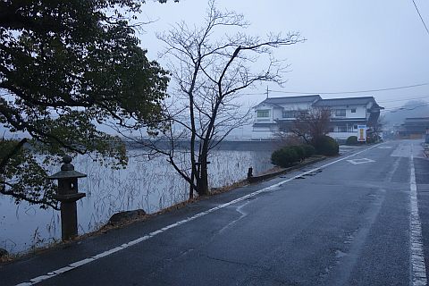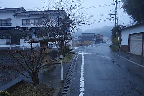 西北西へ100m進み、Y字路を右折して旧県道をさらに西北西へ345m進む