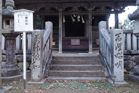 八幡神社の神紋である三つ巴が刻まれた碑を載せている。