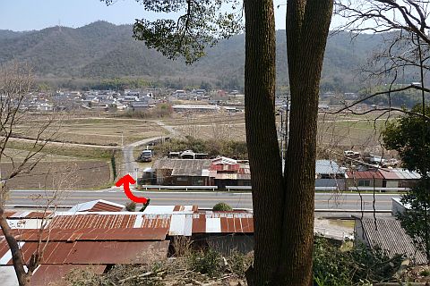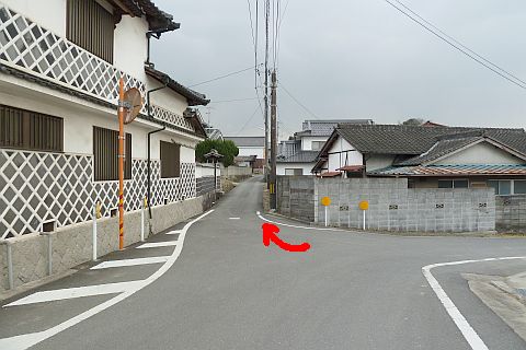 細道を北へ60m下り、90m上って丁字路を右折し、東へ30m進む。