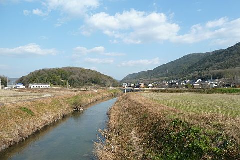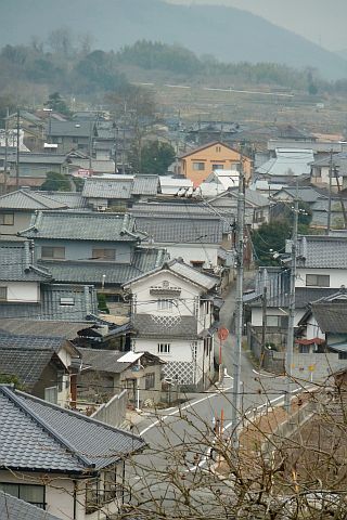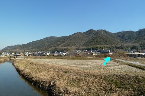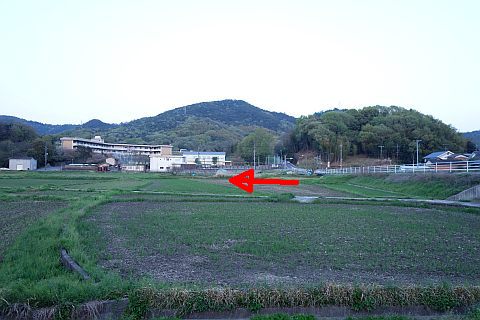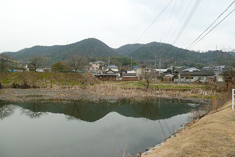 正面手前に見えているのが木山捷平生家。阿部山の麓の向かって左に楠、