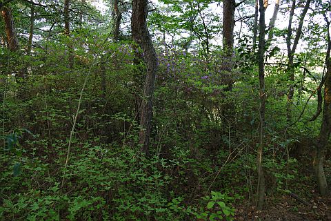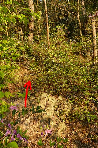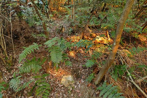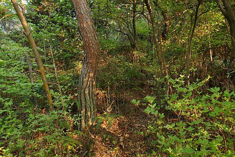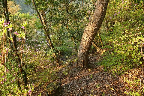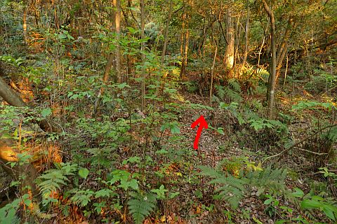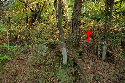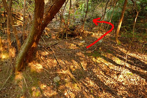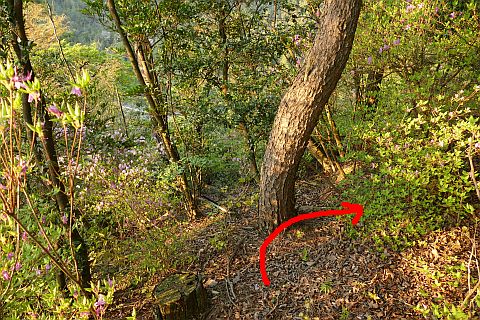 この松がある辺りで左折して西へ30m程進んで右折し、谷筋を北西へ120m程下る