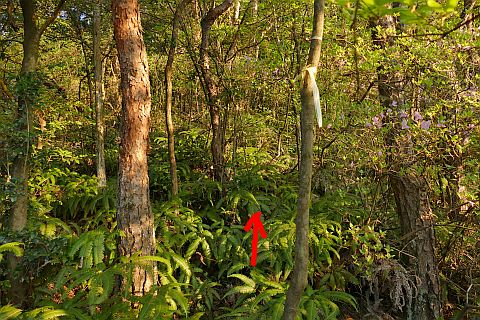 木の枝に取り付けられている赤いビニールテープの目印を頼りに進むことになる。