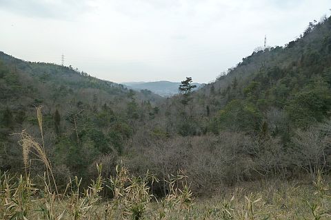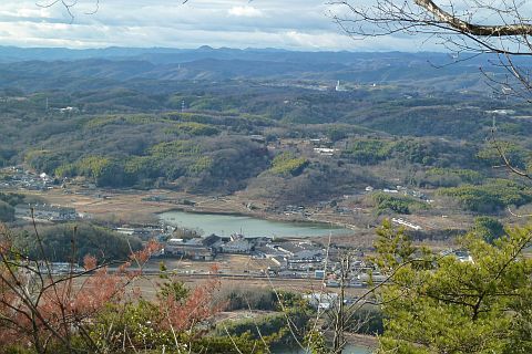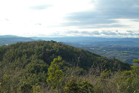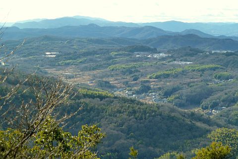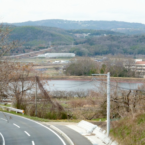 手前から米田池と坊山、ききなの峠と古代の丘スポーツ公園の跨道橋、