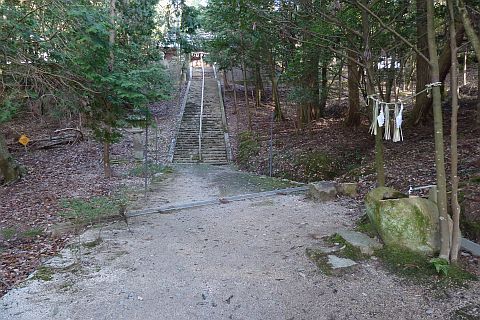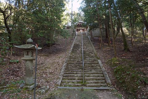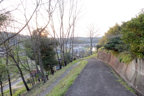 徒歩の場合は左折して新賀と山口の境にあたる道(笠岡市新賀3-1)を南東へ40m上る。
