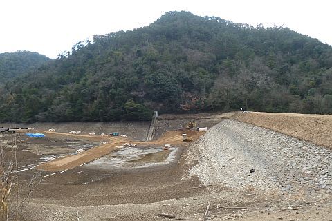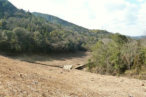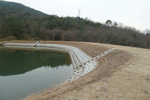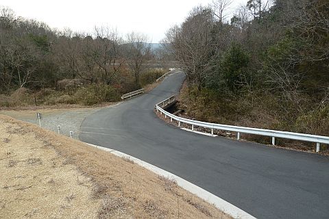 山頂から奥山池の堤体の南端まで下る道は急勾配。