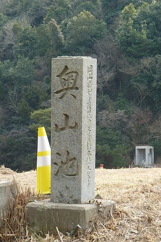 「奥山池」「岡山縣知事 従四位勲三等 橋本清吉 書」「昭和十八年(1943年)三月建之」