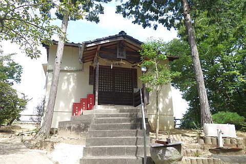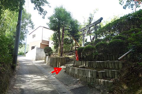 Y字路を右折して参道を南南西へ100m上って右折し、石段を北西へ10m上る。
