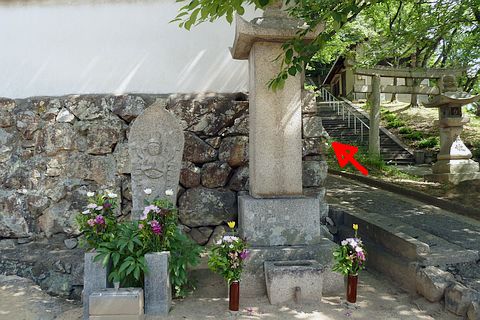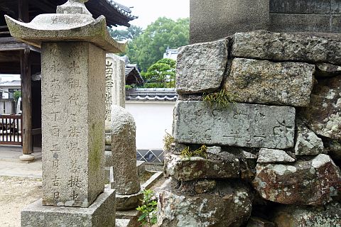 廻国供養塔の後ろの石垣に不要となった道しるべが石材として使われている