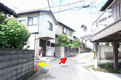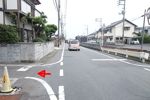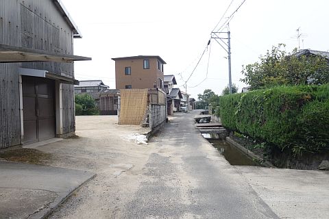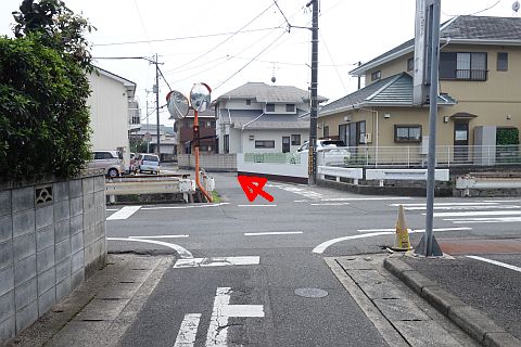 十字路に戻って東へ90m進み、丁字路を右折して南へ35m進む。