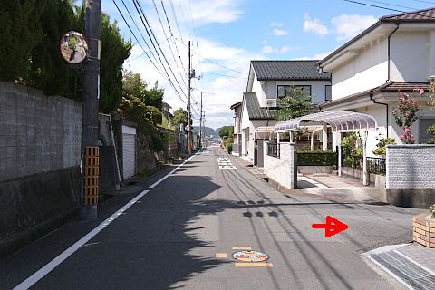 十字路から北北西へ80m進み、心光寺前からさらに15m進んで丁字路を右折