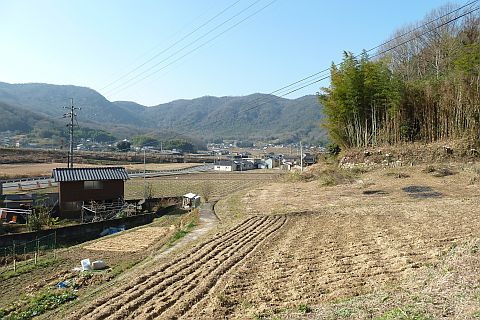 小迫公会堂前の変則丁字路に戻り、左折して南へ60m下り、県道64号線に出る