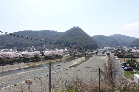 歌碑の前から南の小田川、井原堤の桜、新橋、昭和橋、舞鶴山(井原富士)を望む