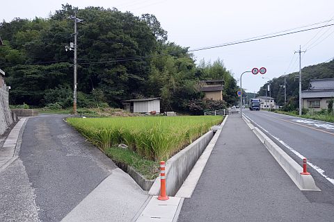 この道の北側(上)が井原市上稲木、南側(下)が笠岡市入田の字 観音面。