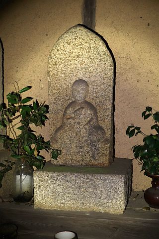 堂内向かって右の壁に旧堂の軒丸瓦が埋め込まれている