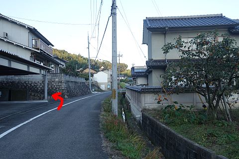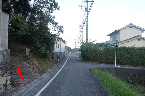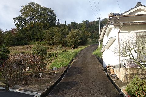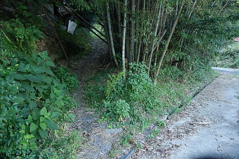 旧県道を左折し、民家の間の細道(墓地への参道)を北西へ43m上る
