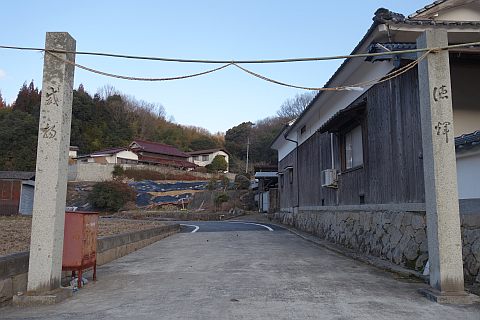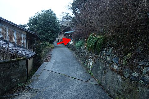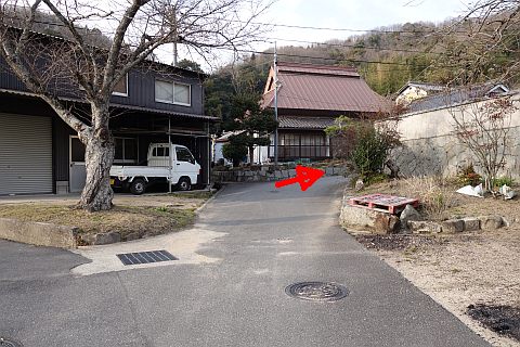 神社の横の丁字路から細道を南南西18m上り、丁字路を右折して西北西へ21m上る