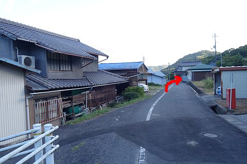 南へ50m下って丁字路を右折し、車道を西へ25m進んで右折