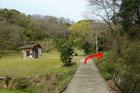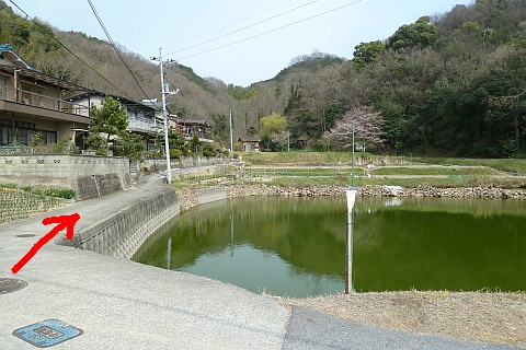 小さな溜池の横の丁字路を左折。北東へ30m進んで右折し、東へ10m程進む。