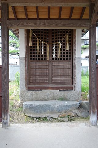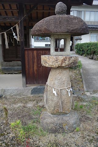 神社(祭神未確認)と自然石の燈籠の横