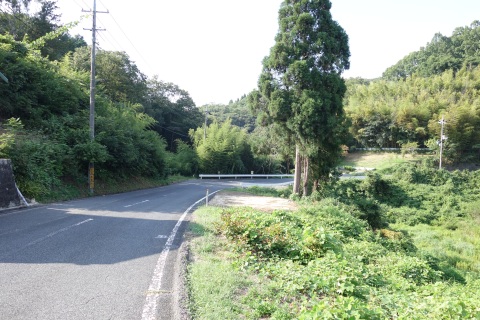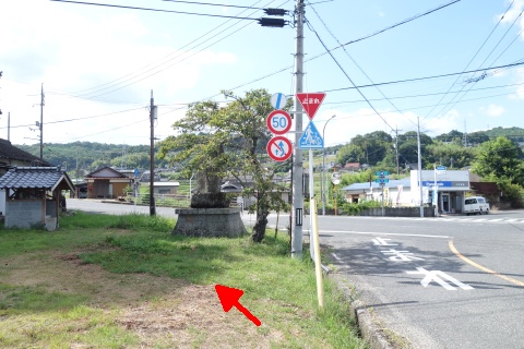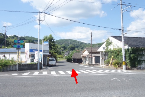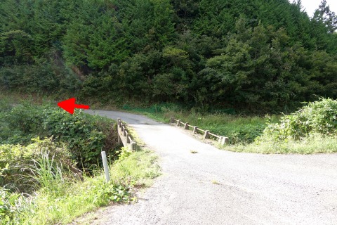 木舟の大師堂から南南西へ1.15km下ると県道48号線の丁字路に出る。